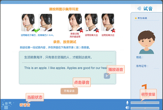 為確??荚嚹軌蛘_M(jìn)行,需進(jìn)行錄音設(shè)備及放音設(shè)備檢查。錄音鍵和播放鍵分別測試耳機(jī)和話筒的情況,可在右下角調(diào)節(jié)音量。