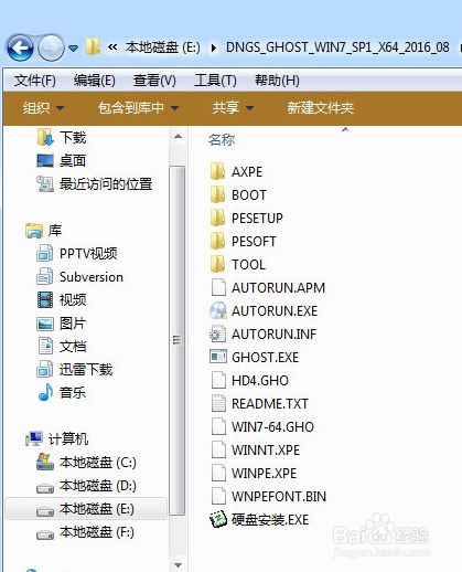 把“WIN7-64.GHO”和“硬盤安裝.EXE”兩個(gè)文件剪切到磁盤根目錄下,這里選擇放在E盤里