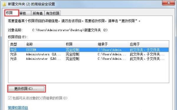 8、在“高級(jí)安全設(shè)置”窗口中單擊“權(quán)限”選項(xiàng)卡并點(diǎn)擊“更改權(quán)限”按鈕;如圖所示: