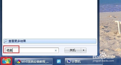 win7精簡(jiǎn)版怎么磁盤分區(qū)點(diǎn)擊屏幕左下角的開始,在搜索框中輸入“磁盤”。