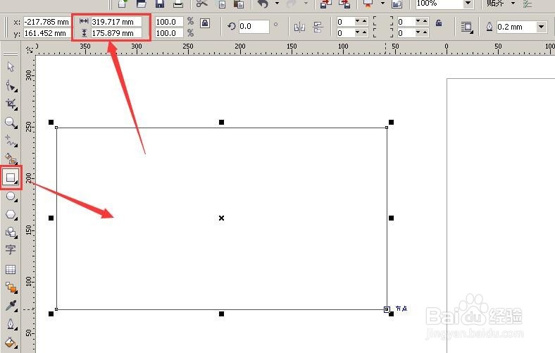 1、首先選擇”矩形工具“隨便畫個(gè)四邊形,畫出來之后看上面紅色框地方,顯示的是這個(gè)四邊的尺寸,581.191 mm*319.717 mm,默認(rèn)都是以毫米為單位的;(圖1)