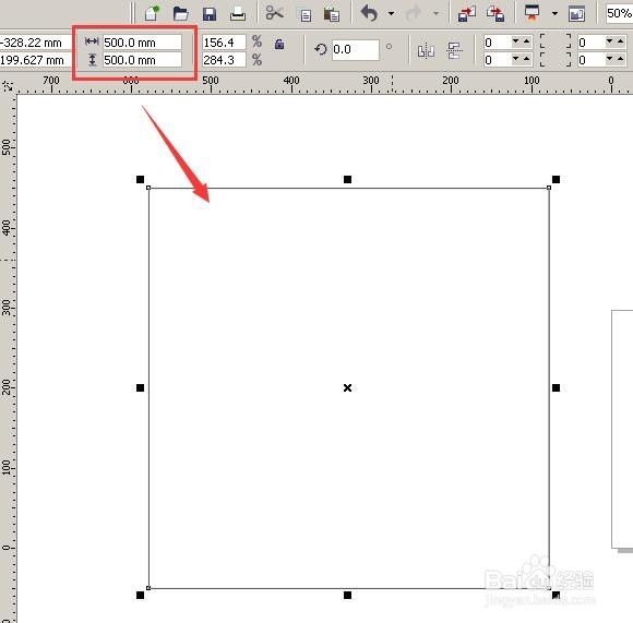 2、如果你想改變這個(gè)四邊形的尺寸,比如想改成50厘米*50厘米,那就在這個(gè)地方直接輸入500*500,按Enter就成了這個(gè)尺寸。(圖2)