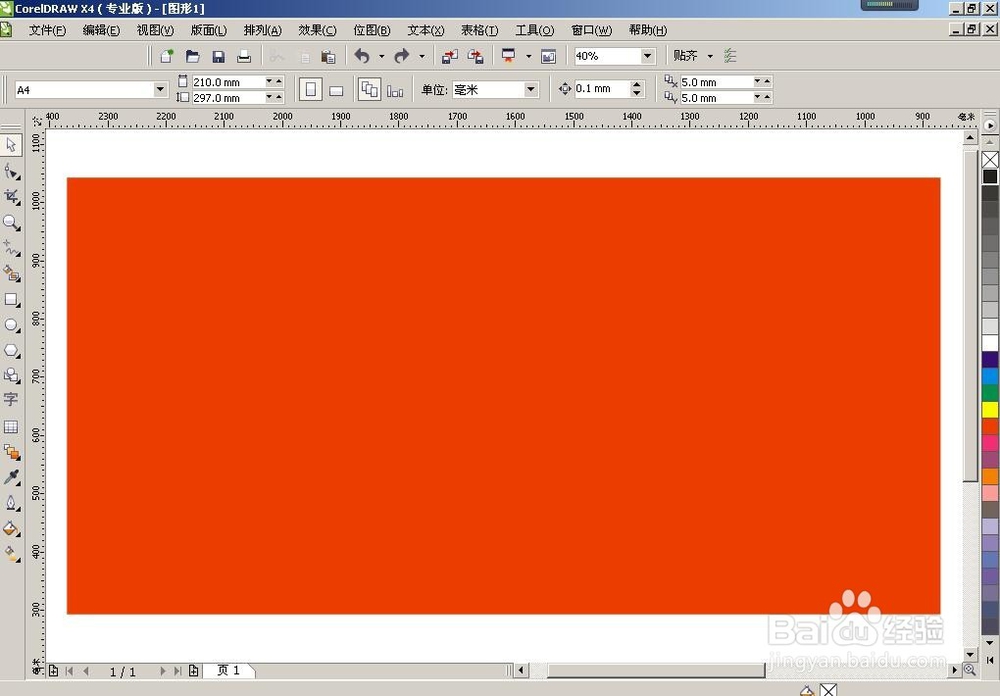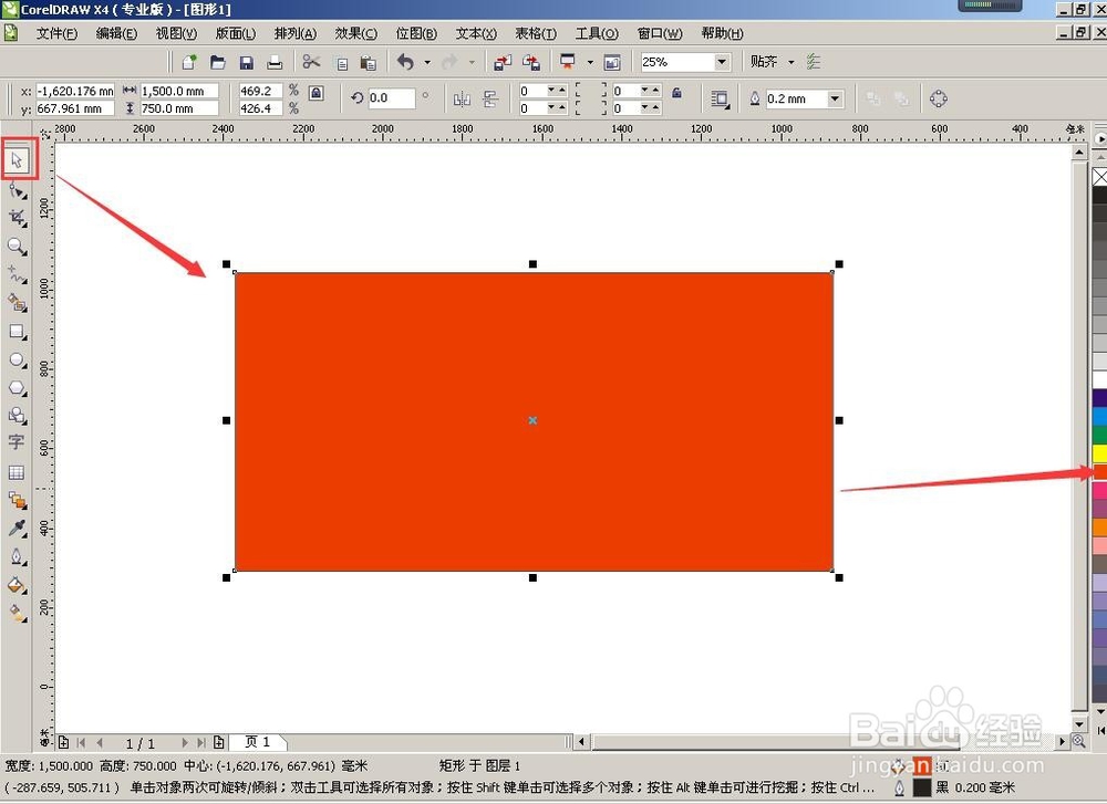 1、給這個(gè)矩形填充一個(gè)好看的顏色,用”挑選工具“選中矩形(左邊工具欄第一個(gè))直接在右邊隨邊點(diǎn)一個(gè)顏色就填充上了(圖1);