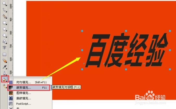 1、好了,調(diào)整好后,給字體填充一個(gè)漸變的顏色放在矩形上,使用工具欄倒數(shù)第二個(gè)“填充”,點(diǎn)開填充工具右下角那個(gè)黑色小三角,選擇“漸變填充”(圖1)