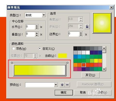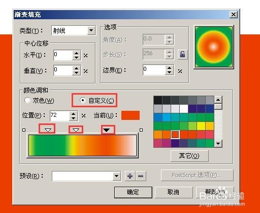 3、選擇自定義,就是可以填充多個(gè)顏色,在顏色條上面鼠標(biāo)雙擊就可以添加顏色,添加后出來個(gè)三角符號(hào),選中三角符號(hào)右邊可以填充你想要的顏色。(圖3、4)