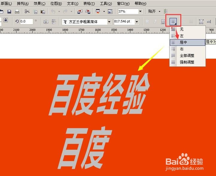 在文字的后面換行再加兩字,選中文字,雙擊就可以添加文字了,按Enter換行輸入”百度“,選中文字,選擇“水平對(duì)齊”下小三角出來下拉單,可以選擇文字對(duì)齊類型;