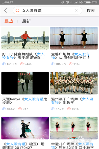 (2)在搜素里輸入你要下載的歌曲名字,如輸入舞曲名字“女人沒有錯”,點擊”搜索“,則會在新的頁面里顯示關于這個舞曲的所有舞蹈,這時可以挑選自己喜歡的進入,這里以第一個為例,點擊進入。