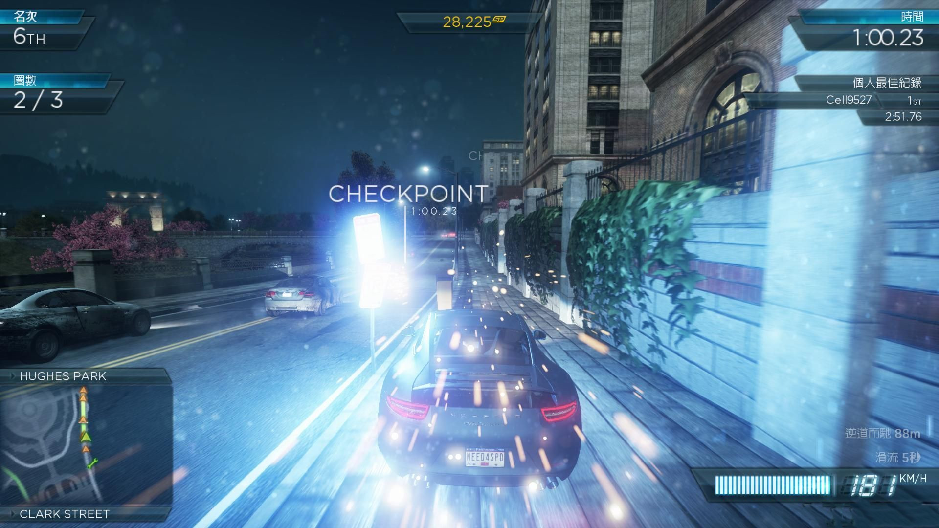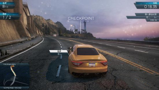 2、速度賽:自從極品飛車9后就沒(méi)有的賽事,是超過(guò)目標(biāo)速度經(jīng)過(guò)檢查點(diǎn),最后把所有檢查點(diǎn)的速度之和加起來(lái)判斷是否能拿名次。下圖中,右上角是目標(biāo)速度,必須大于目標(biāo)速度通過(guò)檢查點(diǎn)