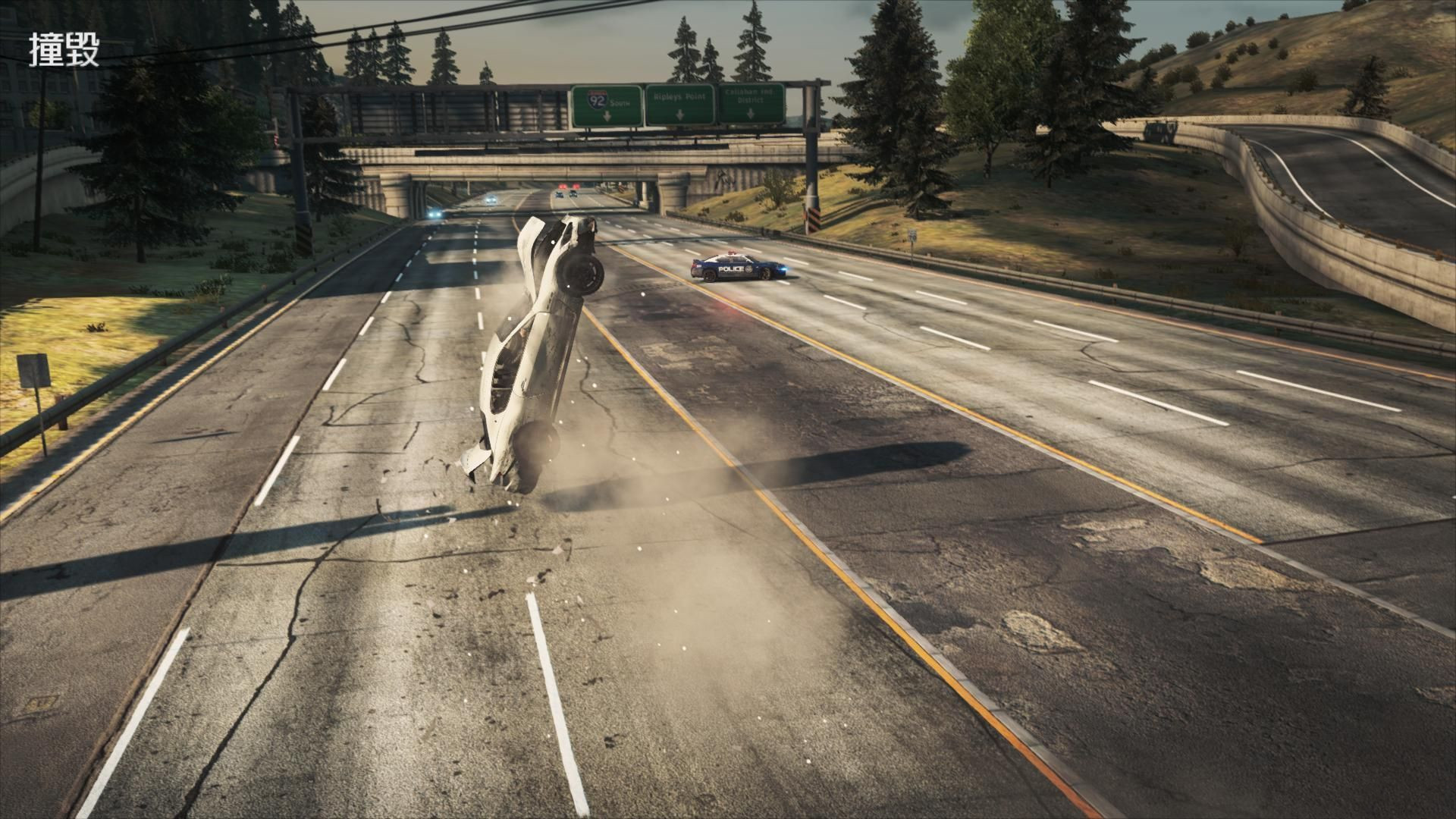 同樣是Criterion Games的一貫的傳統(tǒng),游戲中設(shè)計(jì)的撞車回放的功能,當(dāng)玩家的車輛撞擊到NPC車輛、警車、路障、墻壁、總之一切不該撞上的東西,游戲就會(huì)給這場(chǎng)車禍一個(gè)特寫,之后或放置玩家的車輛不管(在非比賽情況下),或重置玩家的車輛(比賽之中)。