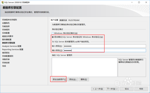 選擇混合模式,輸入sa的密碼,然后點擊添加當前用戶,添加用戶后點擊下一步