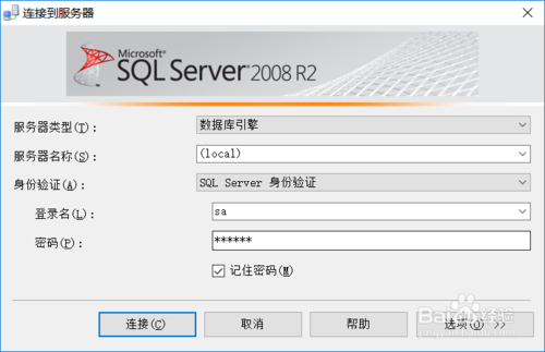 打開新安裝的軟件,按照圖中填寫,注意密碼填寫設(shè)置的sa的密碼,點擊登錄