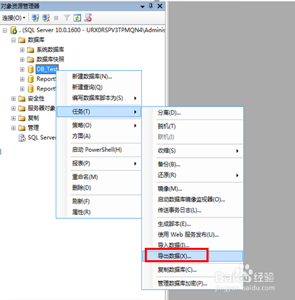 在需要操作的數(shù)據(jù)庫上右鍵之后選擇任務(wù)再之后導(dǎo)出數(shù)據(jù)功能,例子中以DB_Test數(shù)據(jù)庫做演示。