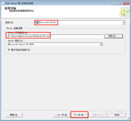 選擇導(dǎo)出的目標為Excel,數(shù)據(jù)庫為默認值即可,選擇Excel的文件路徑之后點擊下一步按鈕繼續(xù)操作。