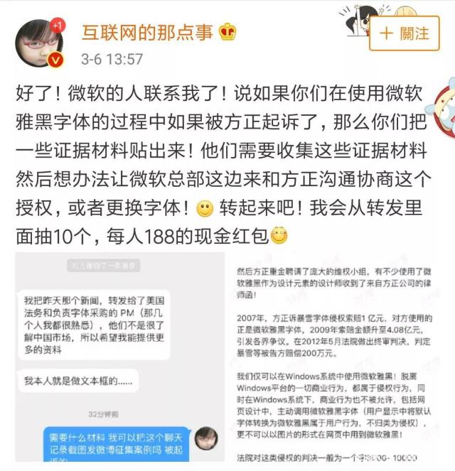 截至目前,“互聯(lián)網(wǎng)的那點事”再發(fā)微博表示微軟的人已經(jīng)聯(lián)系他,他們會想辦法讓微軟和方正協(xié)商授權(quán)或者更換字體。