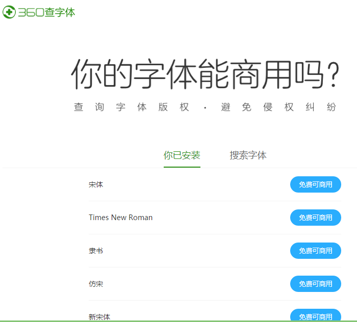 360 官方推出了查字體版權(quán)工具—— 360 查字體,幫助用戶檢測電腦上安裝的字體是否免費或是“商用需授權(quán)”的。【軟件功能】