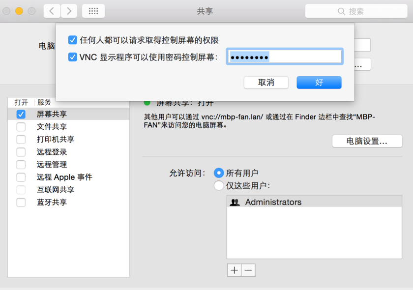 Mac系統(tǒng)偏好設(shè)置-共享-打開屏幕共享,并設(shè)置VNC控制屏幕密碼。