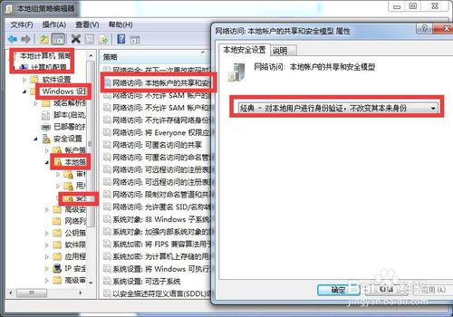 2.依次點(diǎn)選:本地計(jì)算機(jī)策略——>計(jì)算機(jī)配置——>Windows設(shè)置——> 本地策略——>安全選項(xiàng),在安全選項(xiàng)子項(xiàng)的右側(cè)顯示區(qū)域中,找到目標(biāo)組策略選項(xiàng):網(wǎng)絡(luò)訪問:本地帳戶的共享和安全模式