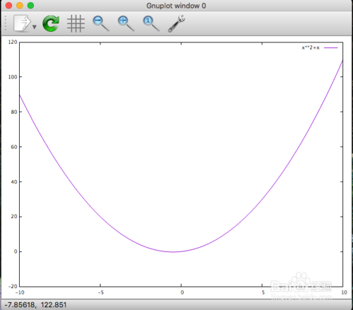 2、進入gnuplot程序后,繼續(xù)輸入plot x**2+x就可以得到f(x)=x^2+x的函數(shù)圖像,非常迅速。