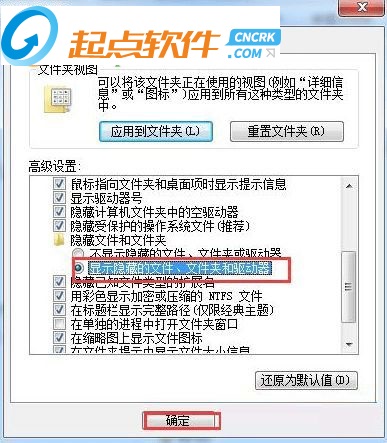 3、進入到文件夾選項設置界面之后將查看選項卡打開,然后找到其中的“顯示隱藏的文件、文件夾和驅(qū)動器”,將它勾選上之后點擊下方的確定按鈕進行保存即可!