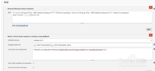 7.這里的Msbuild Version選擇了vs2017里的,jenkins插件庫(kù)中的msbuild版本太低,編譯經(jīng)常出錯(cuò),最簡(jiǎn)單的做法就是安裝VS,然后在“系統(tǒng)管理”->“全局工具配置”中配置VS工具中的msbuild路徑,如下圖所示: