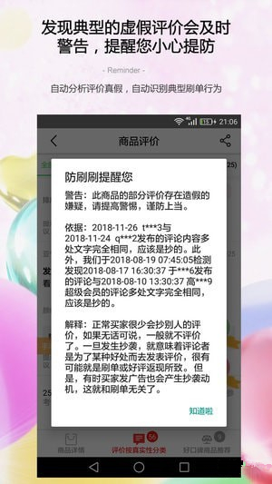 防刷刷app發(fā)現(xiàn)典型的虛假評價會及時警告,提醒您小心提防。