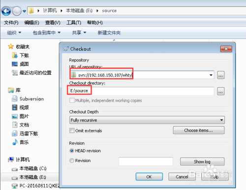 6.輸入svn版本庫的地址和剛才新建的文件夾路徑