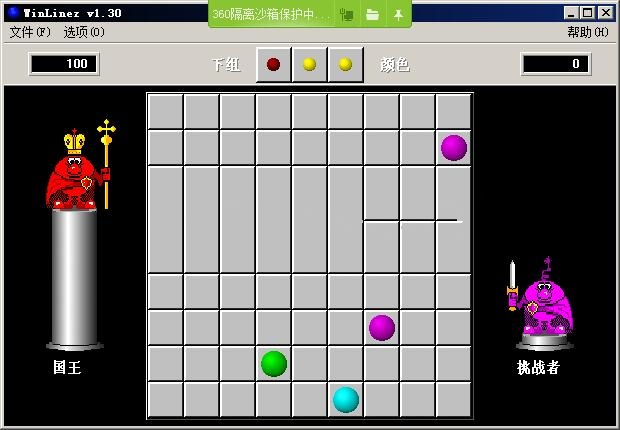 winlinez五連球是一款經(jīng)典好玩的類(lèi)似五子棋的游戲。游戲有一定的難度,你要做的就是移動(dòng)棋盤(pán)上的小球,使最少5個(gè)同顏色的小球連成一條水平線、一條垂直線或一條45度斜線,當(dāng)連成線時(shí),著些小球就會(huì)消除,而你也就會(huì)的到相應(yīng)的分?jǐn)?shù),直到小球充滿整個(gè)棋盤(pán)時(shí),winlinez五連球游戲結(jié)束。小球還可以選擇以圖形方式顯示!