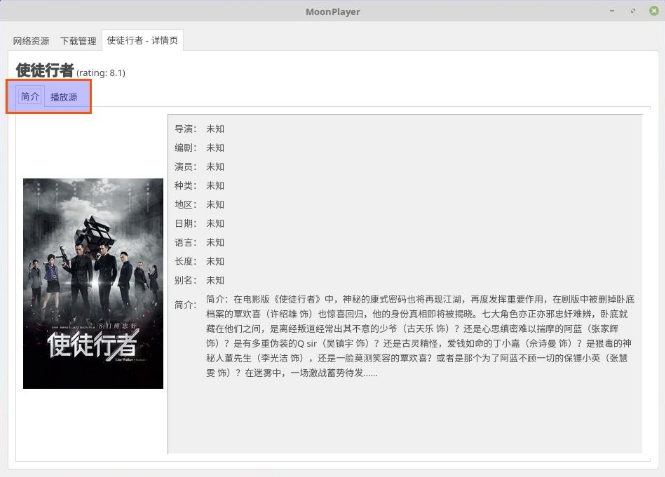 2、雙擊某一影視資源,進入該影視資源的簡介頁面,點擊頂部的“播放源”標簽,可以切換到播放源選擇界面;