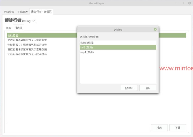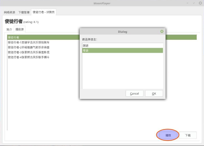 3、在“播放源”界面,選中其一,點擊右下角的播放按鈕,在播放前,月亮播放器會提示選擇語言;