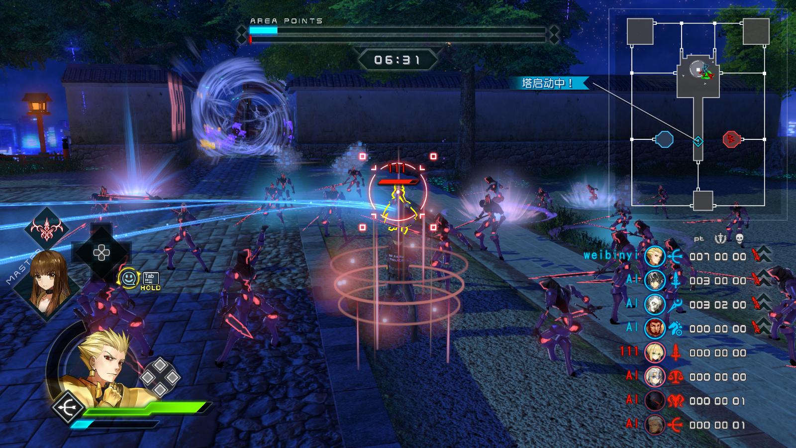 黃色是寶具值(相當(dāng)于必殺技蓄能值),只有在月靈模式下,通過擊殺小兵,敵人才能增加寶具值。