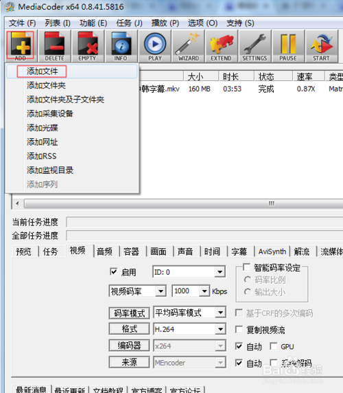 如何使用mediacoder軟件壓制視頻打開mediacoder軟件,點(diǎn)擊add增加需要壓制的視頻文件