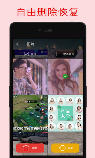1、一鍵掃描,快速檢索手機全部數(shù)據(jù),找到刪除的相片。2、以列表的方式呈現(xiàn)系掃描檢索到的刪除資源,支持全部選擇,讓用戶快速恢復(fù),不需一個個點擊。
