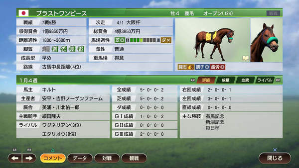 以用強(qiáng)母馬制勝全世界的比賽為目標(biāo),作為業(yè)主的領(lǐng)導(dǎo)人正在鉆研中。充滿自信,好勝的性格。