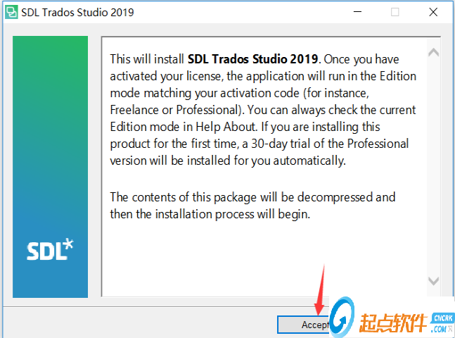 1.首先在起點(diǎn)軟件園下載壓縮包,解壓后雙擊SDLTradosStudio2019.exe運(yùn)行,點(diǎn)accept