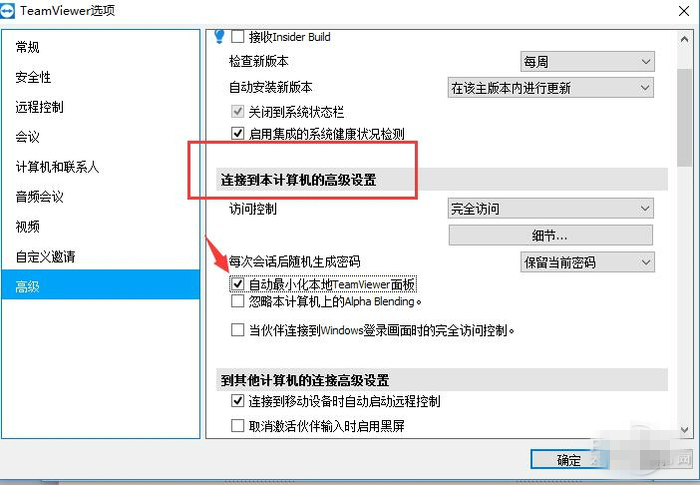 3、拖到下方找到連接到本計算機(jī)的高級設(shè)置,并把自動最小化的選項勾上。