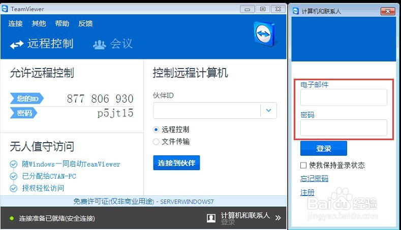 3、在另一臺計算機(jī)中的teamviewer綠色版,并輸入原計算機(jī)的伙伴ID,點(diǎn)擊鏈接,輸入密碼即可建立連接。不過要記得創(chuàng)建teamviewer賬戶才行哦。
