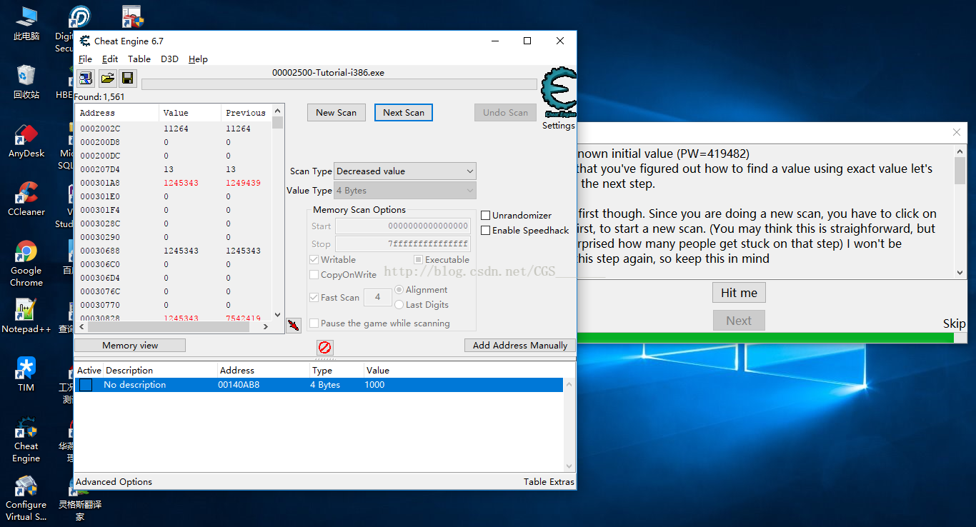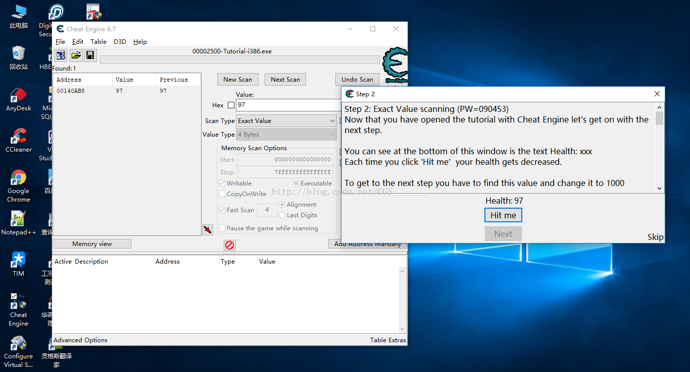 b)繼續(xù)點擊Hit Me按鈕,然后在CE中點擊Next Scan繼續(xù)掃描,這時我們會發(fā)現(xiàn)CE左側(cè)只剩一個Address了,這個地址就是我們要找的血量的地址