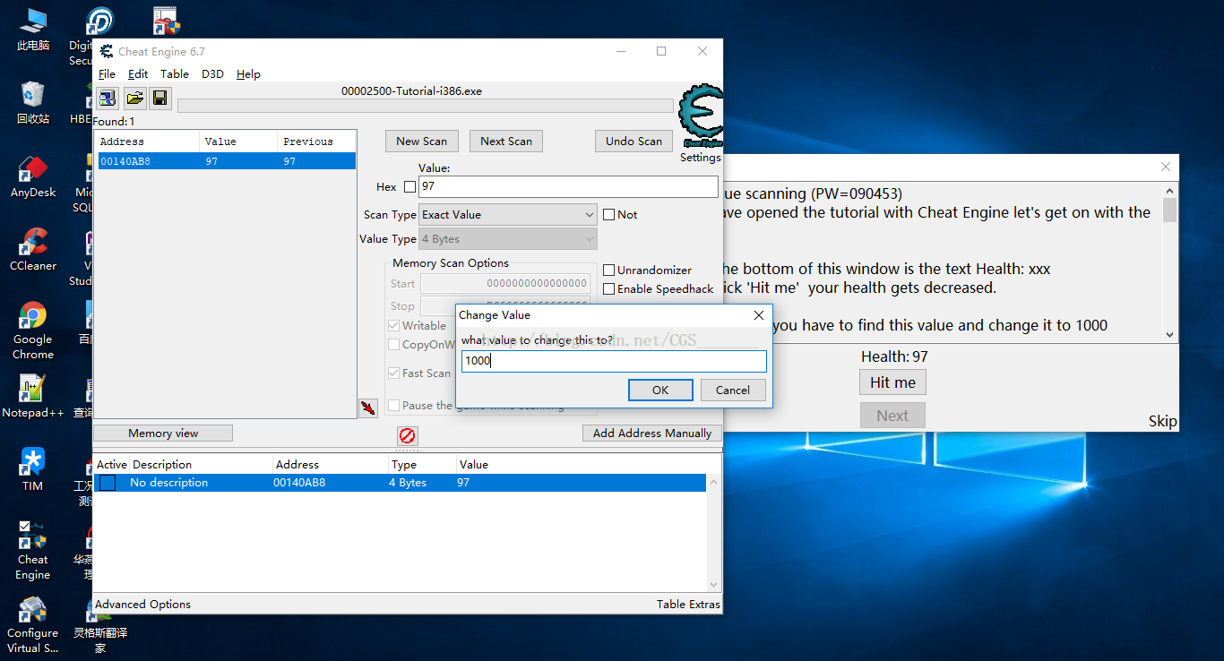c)雙擊CE左側(cè)的地址,我們會發(fā)現(xiàn)它被添加到CE下方的列表中,雙擊列表中的Value,修改成1000,通關(guān)