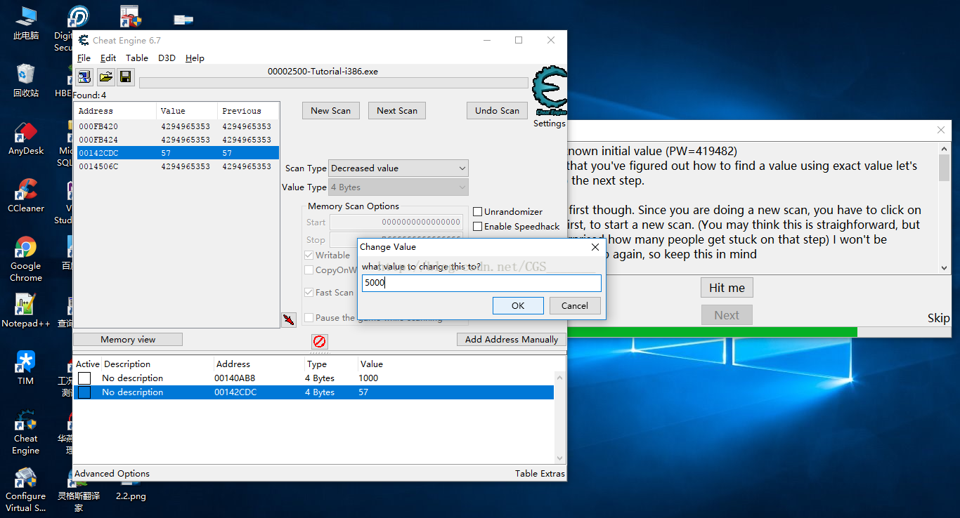 c)此時我們依然不知道血量值是哪一個Address地址,沒關(guān)系,按照這一步操作來我們就可以輕松找到血量值地址:繼續(xù)點擊Hit Me,返回CE點擊Next Scan,重復循環(huán)此步驟直到CE左側(cè)出現(xiàn)極少數(shù)的Address,我們選擇變成紅色的或者你覺得最像血量的address雙擊它添加到CE下方的列表中,修改其Value值等于5000,通關(guān)