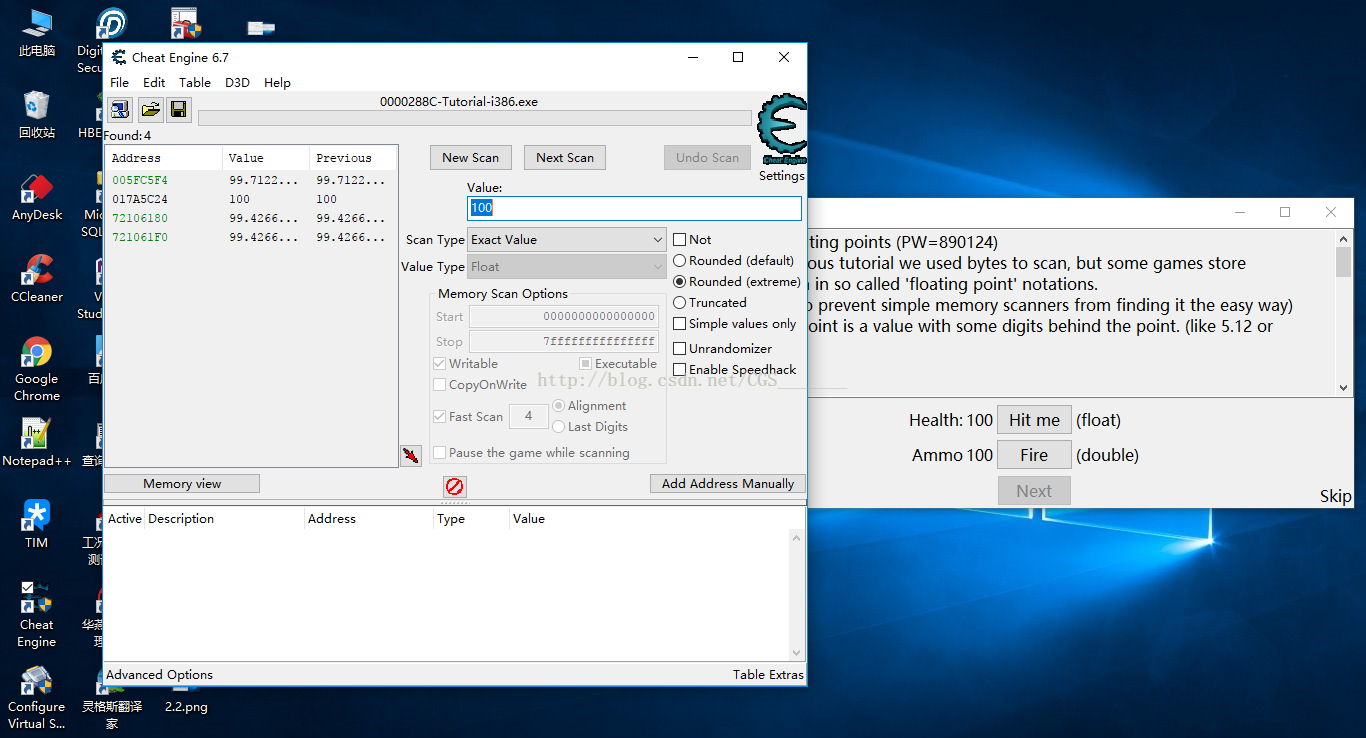 a)在CE的Value值中填入100,注意不要勾選HEX復選框,點擊First Scan第一次掃描,這時候會發(fā)現(xiàn)CE左側(cè)有很多個Address地址,但是我們不知道哪一個Address是血量Health的地址