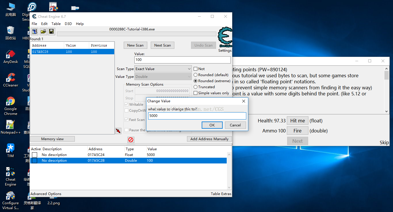 這一關(guān)的目的是讓我們了解有些游戲或程序的數(shù)據(jù)存儲的“Value Type”不是“4 Bytes”,而是“Float”、“Double”這種單/雙精度浮點值。這一關(guān)與Step 2類似,只是修改了"value Type"類型進行了兩次掃描(一次float單精度,一次double雙精度掃描)。通關(guān)條件為將Health和Ammo都修改成5000,具體步驟不再描述,見下圖: