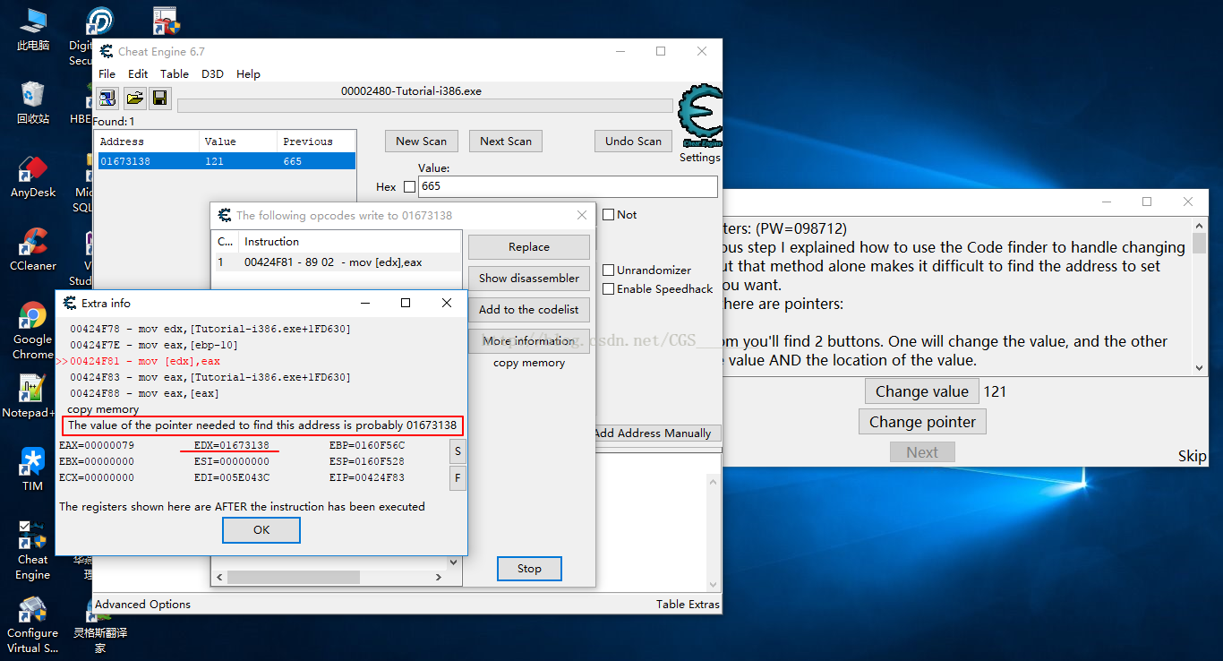 c)點擊“Change Value”按鈕,雙擊代碼彈出“Extra info”窗口記下偏移值和可能的地址,下圖的偏移值是18,可能的地址是0017EA40,在不同計算機上找出來的地址和偏移可能不一樣。重復同樣的步驟,就像Step6中一樣,直到找到這個指針的基址。找到最后,基址的顏色變綠。