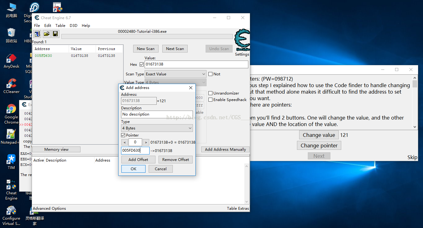 d)手動添加地址,勾選pointer復選框,將基址和上一部中我們記錄的每級指針的偏移量填入,修改指針value并凍結(jié)active,過關(guān)。