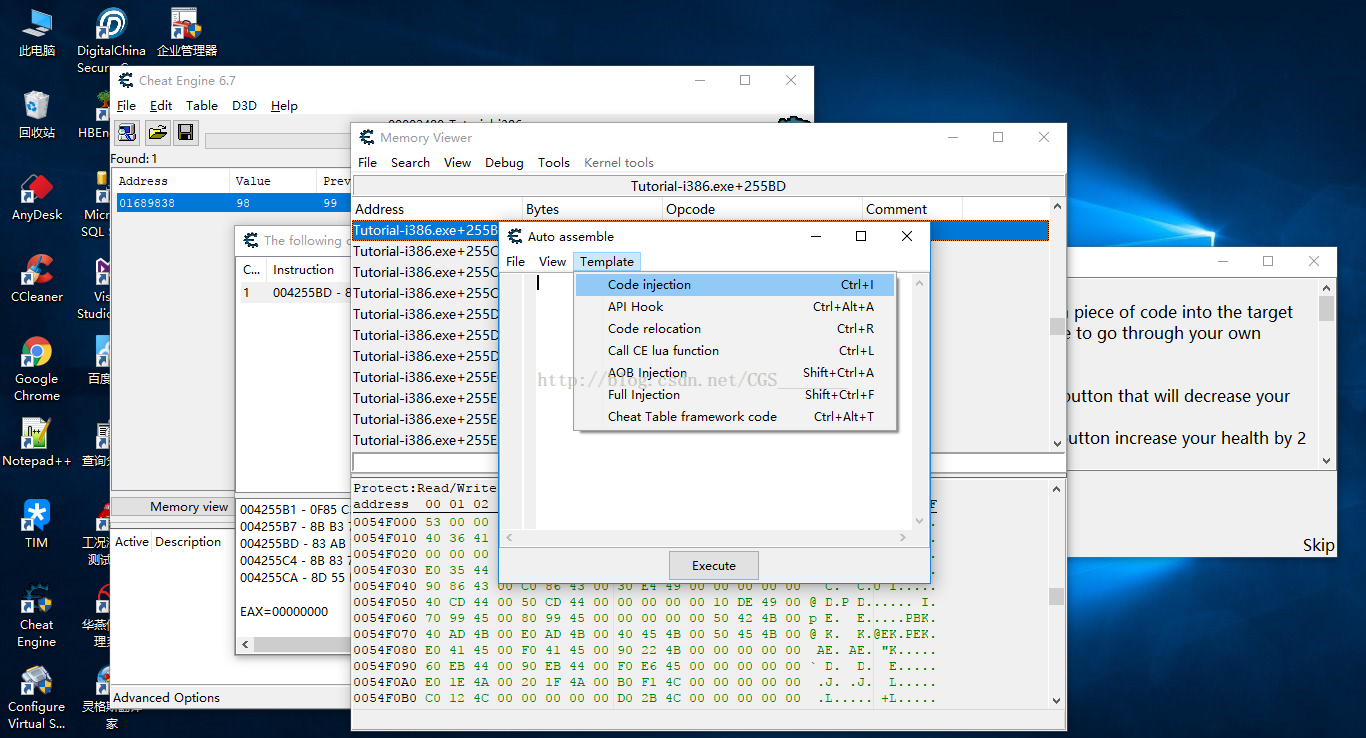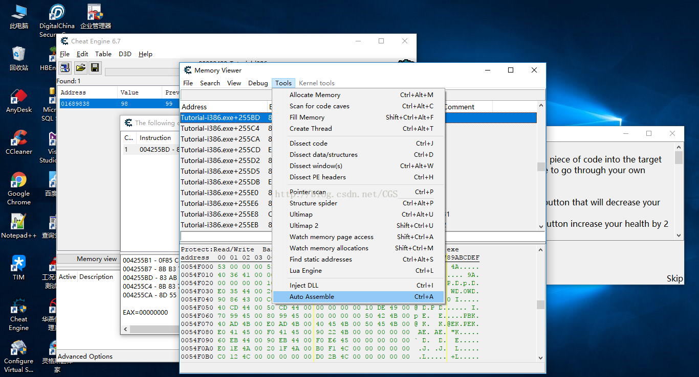 b)點擊“Show disassembler”顯示反匯編后,會彈出“Memory Viewer”內(nèi)存查看器窗口并且自動選中我們剛才查找到的代碼,我們選擇該窗口的“Tools”菜單下的“Auto assemble”自動匯編選項,在彈出的“Auto assemble”自動匯編窗口的“Template”模板菜單下選擇“Code jection”代碼注入選項,如下圖所示: