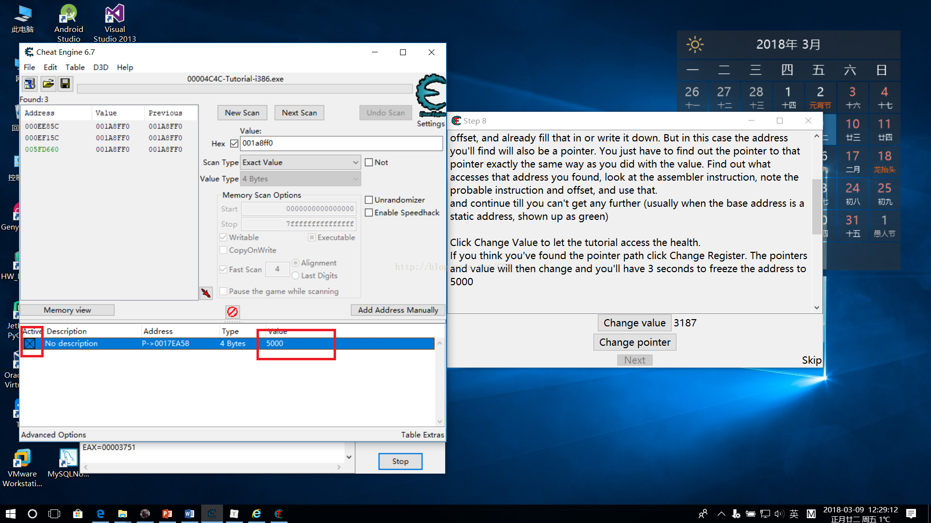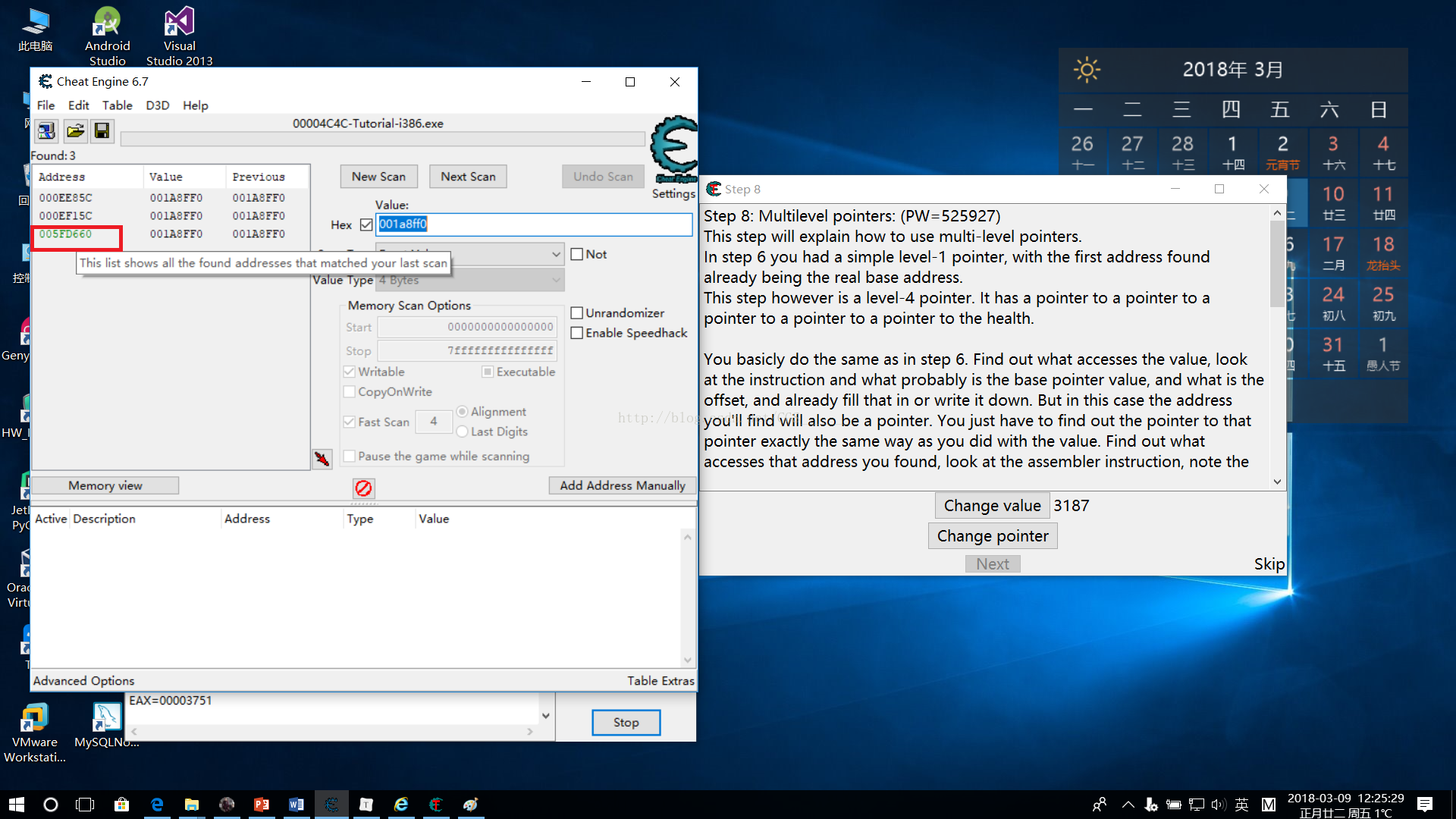 這一關(guān)的目的是讓我們學會如何查找多級指針,通過Step6我們了解并尋找了一個一級指針,Step8中的指針為四級指針,有四個偏移(每臺計算機上的偏移量可能不同)。通關(guān)條件是尋找到這個多級指針改變其值為5000并且凍結(jié)指針活動。