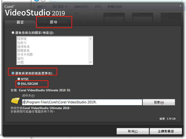 4:點(diǎn)擊“選取所有使用的視訊標(biāo)準(zhǔn)”,點(diǎn)擊“PAL/SECAM”。是否選擇跟換安裝位置,看自己個(gè)人習(xí)慣,不建議安裝到C盤。選擇好之后,先不要點(diǎn)擊立即安裝,點(diǎn)擊“選項(xiàng)”。這里有個(gè)小暗艙需要注意一下。