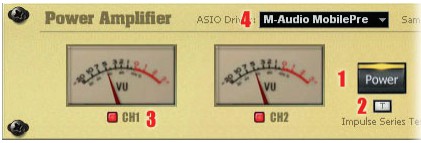 1)功放電源開關(guān):按下此開關(guān),系統(tǒng)將會按照當(dāng)前配置初始化聲卡 ASIO 驅(qū)動,并進(jìn)入運(yùn)轉(zhuǎn)狀態(tài)。如果當(dāng)前配置無法被初始化,電源燈將不會變亮。