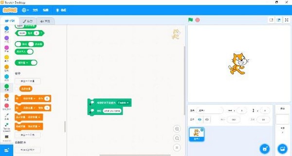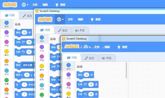 模塊分類與指令集合都放在了左側,腳本區(qū)在屏幕的中央,而舞臺與角色區(qū)則移到了屏幕右側