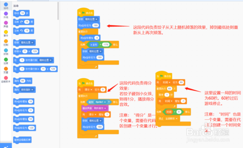 餃子的效果:從天上隨機掉落,如果碰到小女孩,則得分。代碼如圖;