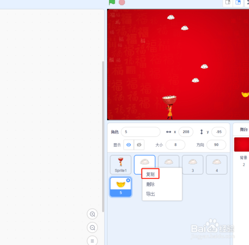 在角色區(qū)右鍵選擇復制,將餃子角色多復制幾個吧。為了增加游戲的趣味性, 將其中一個餃子角色造型換成元寶,得分設置設為10分,得分音效更酷炫。代碼如圖;